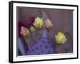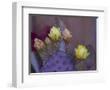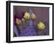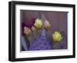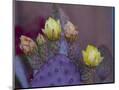 Usa, Arizona, Tucson. Yellow and pink flowers on purple Prickly Pear Cactus.