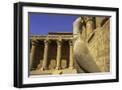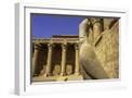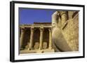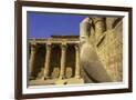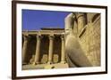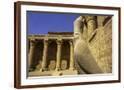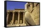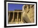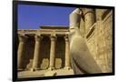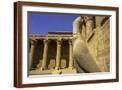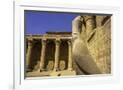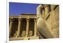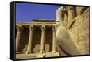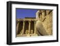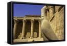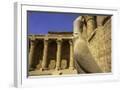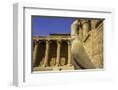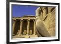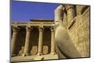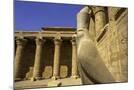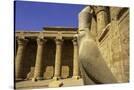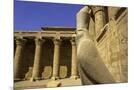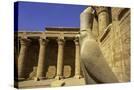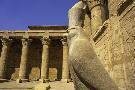 View of statue of Horus the falcon outside the doorway to the sandstone Temple of Horus at Edfu
