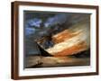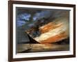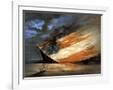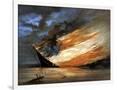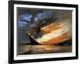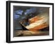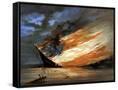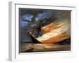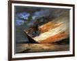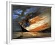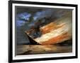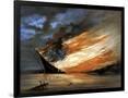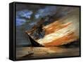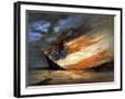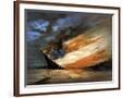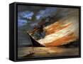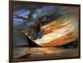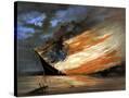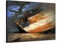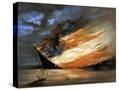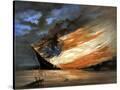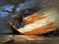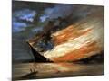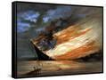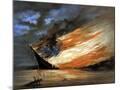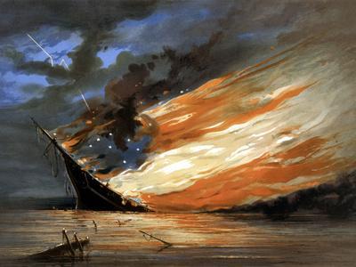 Vintage Civil War Painting of a Warship Burning in a Calm Sea