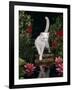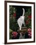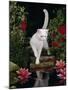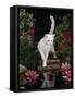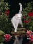 White Domestic Cat Watching Goldfish in Garden Pond