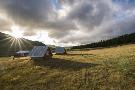 Wooden houses at sunrise, Burentogtokh district, Hovsgol province, Mongolia, Central Asia, Asia
