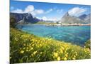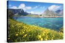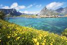 Yellow flowers in bloom beside the turquoise sea and the fishing village of Sakrisoy, Reine, Mosken