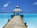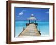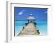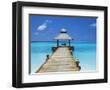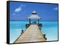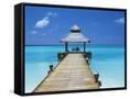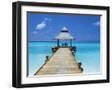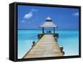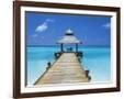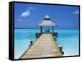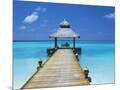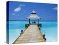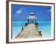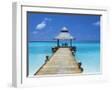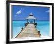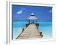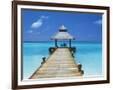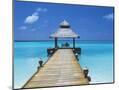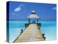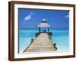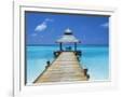 Young Woman Sitting on Bench at the End of Jetty, Maldives, Indian Ocean