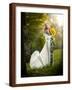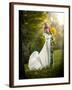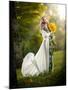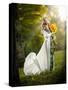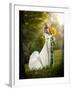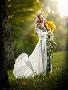 Young Woman Wearing a Long White Dress Holding Sunflowers Outdoor Shot. Portrait of Beautiful Blond
